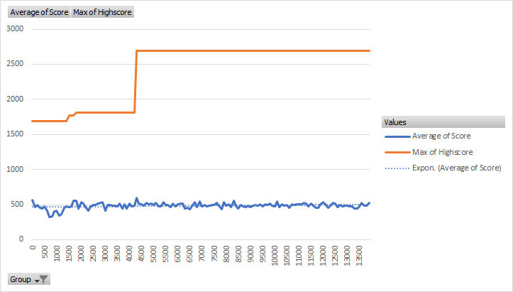 As one can see, there was a slight increase of the model's capability as time went on. However, interestingly enough, the most successful average was during the first 100 generations. As such, I presumed that upon further training, the model would increase. However, as this training took eighteen and a half hours, I wished to simplify the model. In addition, I added the slight punishment for having the board filled, presuming that this punishment would assist the AI. I halved the complexity of the model and ran another test from scratch which ran for twenty hours reaching 2350 generations with the following results.